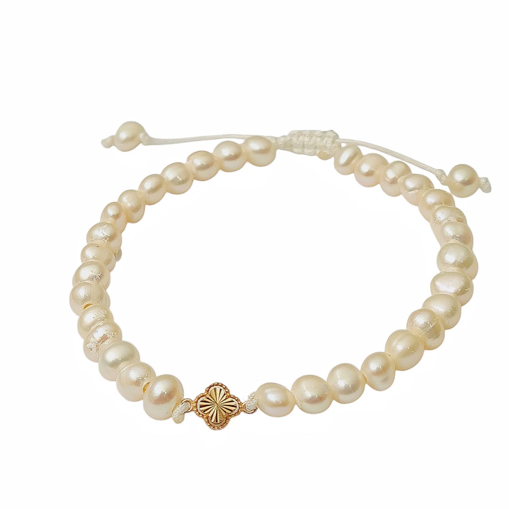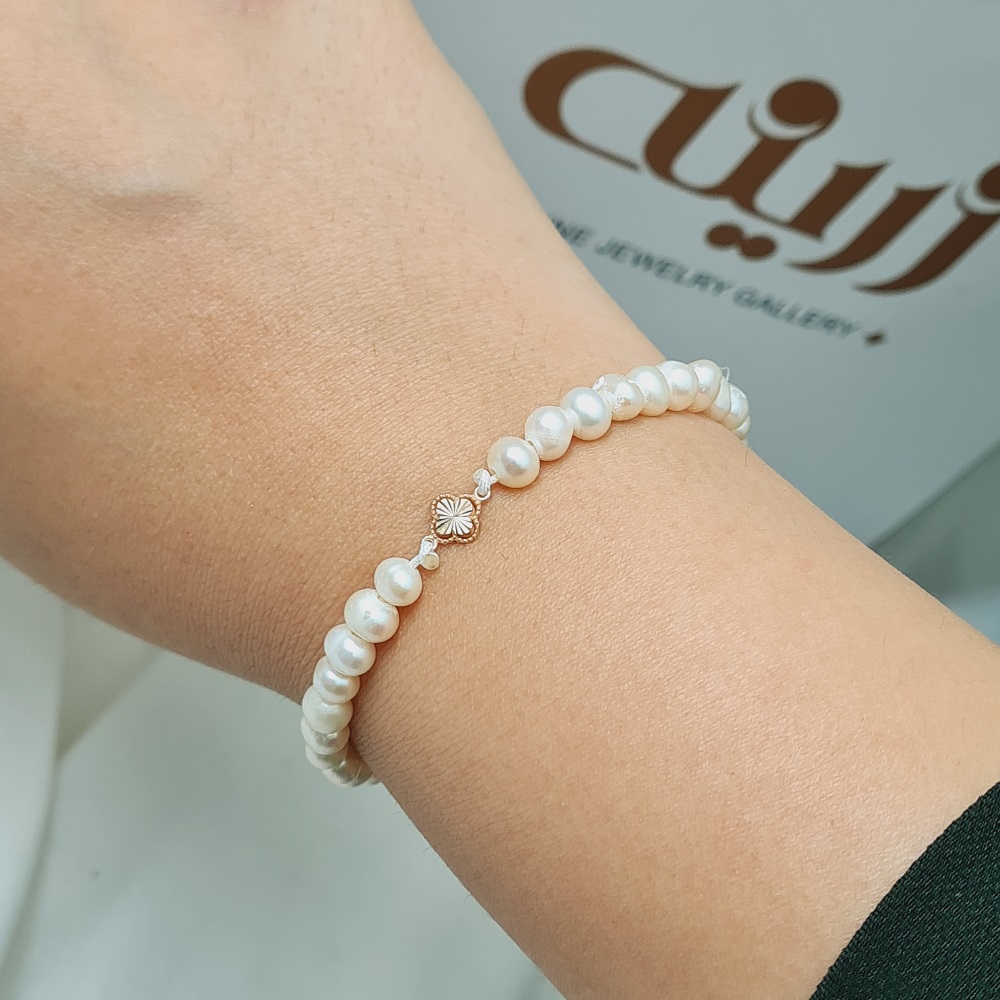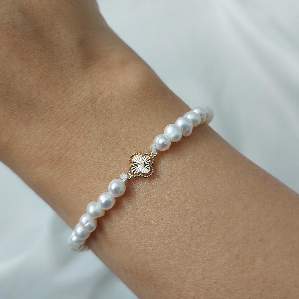دستبند طلا شبدر آسانسوری با مروارید پرورشی